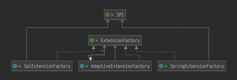 我们可以看到基本上这里只是个工厂类的壳子,相应的扩展类并没有被加载,因为扩展点实现类的加载也是延迟的。至于这个ExtensionFactory,因为它本身也被标注为@SPI扩展点,在获取它的ExtensionLoader时也会来这里走一遭,所以在这里进行了特殊的判断,打断了循环。