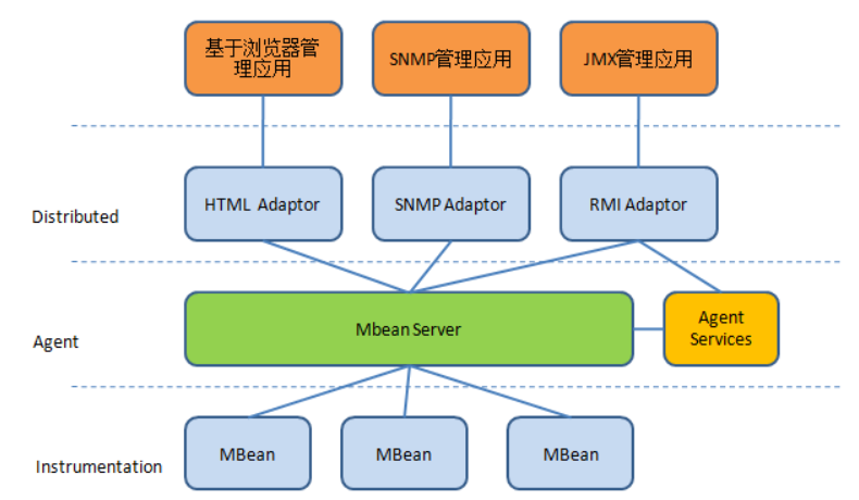 | Agent | 用来管理相应的资源,并且为远端用户提供访问的接口。该层的核心是 MBeanServer , 所有的 MBean 都要向它注册,才能被管理 。注册在 MBeanServer 上的 MBean 并不直接和远程应用程序进行通信,他们通过协议适配器( Adapter )和连接器( Connector )进行通信。 |