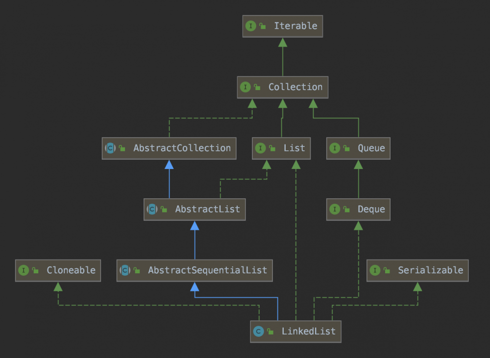 可以看出,LinkedList继承了一个父类AbstractSequentialList,另外实现了4个接口,分别是Cloneable、List、Deque、Serializable。