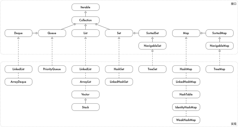HashMap : hash 表实现的 map,插入删除查找性能都是 O(1),key 没有顺序 TreeMap : 红黑树实现的 map,插入删除查找都是 O(lgn),key 按从大到小顺序排列 Hashtable : hash 实现,线程安全,key 和 value 都不能为空,key 没有顺序 LinkedHashMap : hash + 链表实现,按插入顺序排序 IdentityHashMap : 判断 key 相等的条件是,两个引用指向同一个对象,即 key == e.key WeakHashMap : 弱引用 map,不会获取数据的强引用,当数据被 GC 清理时,数据将被删除 Map 的主要接口如下: