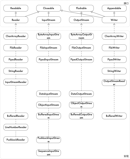 CharArrayReader : 字符数组输入流 FileReader : 文件字符输入流 PipedReader : 管道输入流,可以和 PipedWriter 连接,通常用于线程间通信 StringReader : 字符串输入流 BufferedReader : 带缓冲 buffer 的字符输入流 LineNumberReader : 带行号的字符输入流 PushbackReader : 能回退的字符输入流 InputStreamReader : 输入字节流转字符流 Reader 提供如下接口: