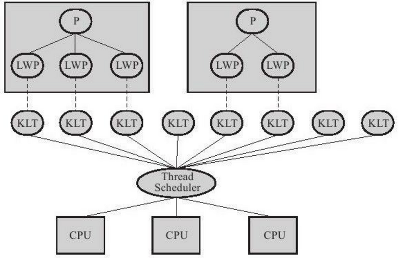 程序一般不会直接去使用内核线程,而是去使用内核线程的一种高级接口——轻量级进程(Light Weight Process,LWP),轻量级进程就是我们通常意义上所讲的线程,由于每个轻量级进程都由一个内核线程支持,因此只有先支持内核线程,才能有轻量级进程,对应关系如下:(p:用户,LWP:轻量级线程,KLT:内核线程,Thread Scheduer:线程池)