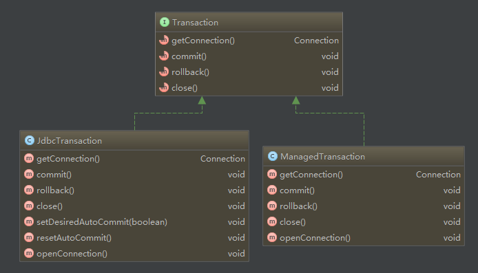 ManagedTransaction:含义为托管事务,空壳事务管理器,皮包公司。仅是提醒用户,在其它环境中应用时,把事务托管给其它框架,比如托管给Spring,让Spring去管理事务。