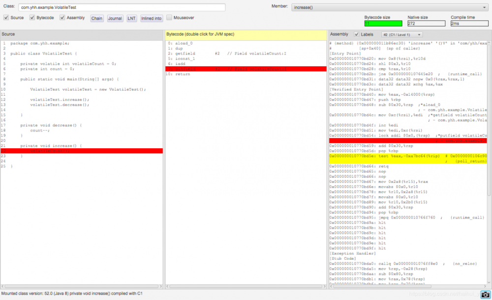 前面又说到,如果当前系统是多核处理器则会在添加 lock 指令前缀,否则就不加。而 volatile 是在给变量赋值时会加 lock 指令的。如图: