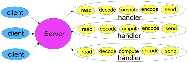 ④ 当有I/O事件就绪时,相关的subReactor就将事件派发给响应的处理器处理。注意,这里subReactor线程只负责完成I/O的read()操作,在读取到数据后将业务逻辑的处理放入到线程池中完成,若完成业务逻辑后需要返回数据给客户端,则相关的I/O的write操作还是会被提交回subReactor线程来完成。