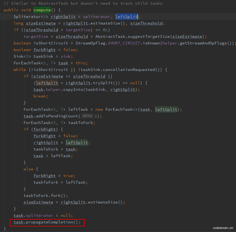 为了找出这个不正确使用方式导致的出错的原因,我看了看相关的源代码 java.util.stream.ForEachOps.ForEachTask#compute :