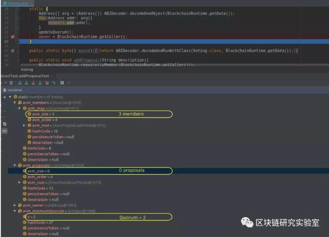 合约中的static块在部署时仅执行一次。 我们在此块中设置初始成员,minimumQuorum和所有者。尽管我们与一组成员启动了合约,但所有者随后也可以添加和删除成员。