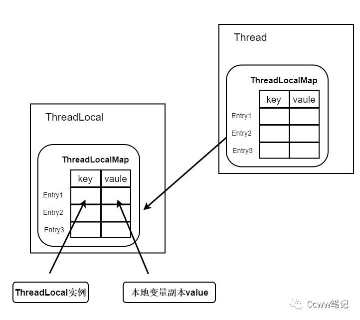 ThreadLocal内部维护的是一个类似Map的ThreadLocalMap数据结构,而每个Thread类,都有一个ThreadLocalMap成员变量。ThreadLocalMap将线程本地变量(ThreadLocal)作为key,线程变量的副本作为value,如图所示: