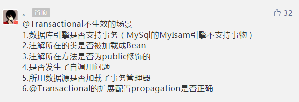 也像文章开头说的那样,本文不一定总结得全,只是总结常见的事务失效的场景,即使如此,这 8 点已经足以帮你吊打面试官了,如果你还知道其他场景也欢迎留言分享。