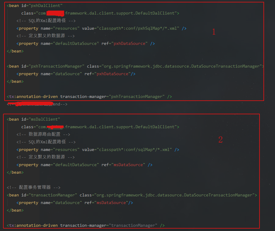 上图的 1 是后来的,后来者居上嘛, pxhTransactionManager 是没有问题的,因为好名字 transactionManager 已经被我们占了嘛(首发除了探坑还是有好处的),问题应该就出在了又定义了一次 <tx:annotation-driven> 标签。