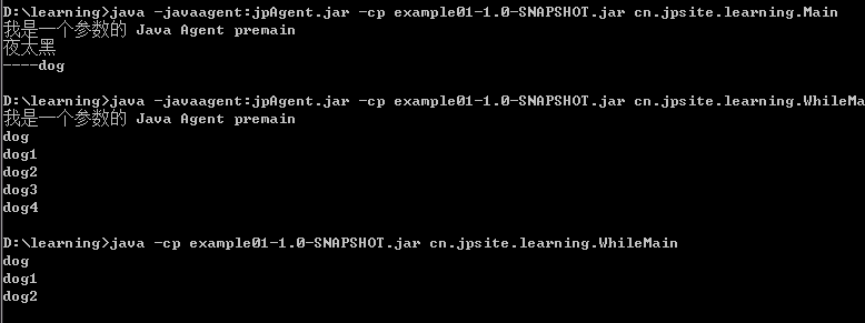 先执行 java -cp example01-1.0-SNAPSHOT.jar cn.jpsite.learning.WhileMain 启动example01程序,看到如下结果,还记得我们之前准备了一份Dog.class,里面的say()内容是cat的嘛,稍后你就会看到神奇的一幕