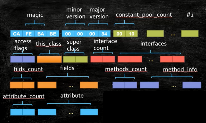 minor 小版本号 major version 大版本号,这里十六进制的 34 也就是对应着十进制的 52,也就是 Java8 constant pool_count 常量池里有多少个常量 constant pool 常量池里都有些啥,划重点,等等要烤的 access flags 这个类的标识信息,比如 private、default、protected、public,是 class 还是 interface this_class 当前类 super_class 还要讲嘛,父类 interface_count 接口的数量 interfaces 具体的接口 filds_count 有多少个字段 fields 有哪些字段,也就是属性啦 methods_count 方法有多少个 methods 方法都有些啥 attribute_count 参数个数 attribute 参数,里面最最重要的就是 code -- 代码