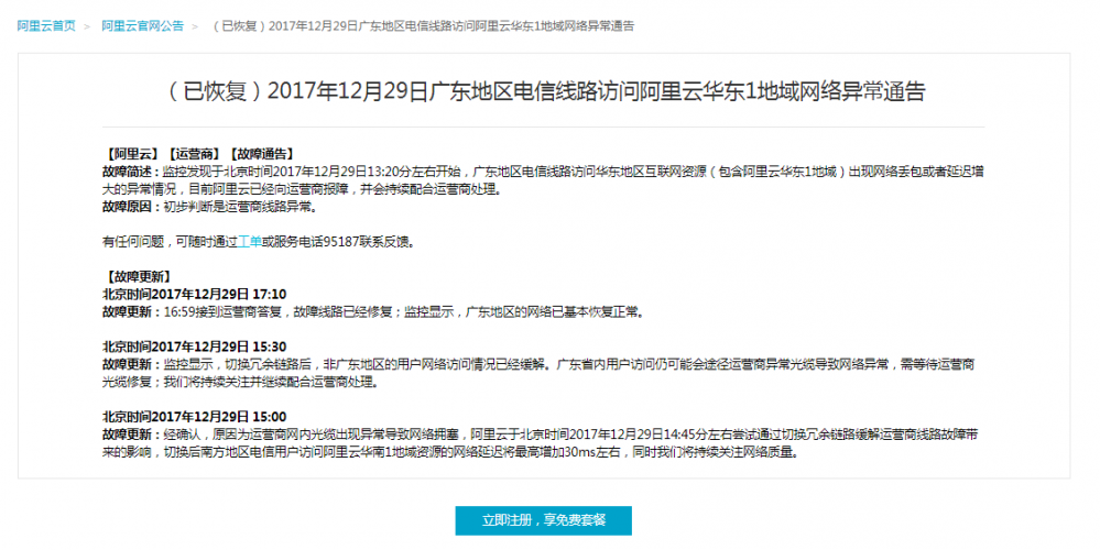 此外,如果对系统以及应用进行排查后,均未发现异常现象的根本原因,那么也有可能是因为外部基础设施 IAAS 平台所引发的问题。例如运营商网络或者云服务提供商偶尔可能也会发生一些故障问题,你的引用只有某个区域如广东用户访问系统时发生服务不可用现象,那么极有可能是这些原因导致的。今天,我司部署在阿里云华东地域的业务系统中午时分突然不能为广东地区用户提供正常服务,对系统进行各种排查均为发现任何问题。最后,通过查询阿里云公告得知原因是”广东地区电信线路访问华东地区互联网资源(包含阿里云华东1地域)出现网络丢包或者延迟增大的异常情况”。