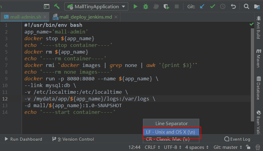 上传脚本前在IDEA中修改所有脚本文件的换行符格式为 LF ,否则脚本会无法执行;