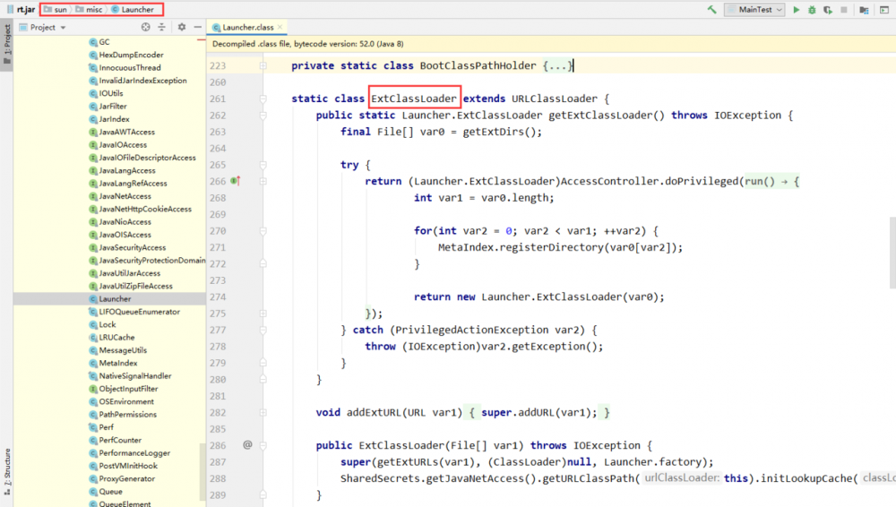 Extensions ClassLoader(扩展类加载器)具体是由 ExtClassLoader 类实现的, ExtClassLoader 类位于 sun.misc.Launcher 类中,是其的一个静态内部类。对于 Launcher 类,可以先看成是Java虚拟机的一个入口。