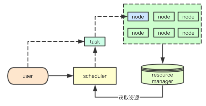 | scheduler | 结合当前集群的资源和用户提交的任务信息,选择合适的node节点当前的资源,分配节点任务,尽可能保证任务的运行 |