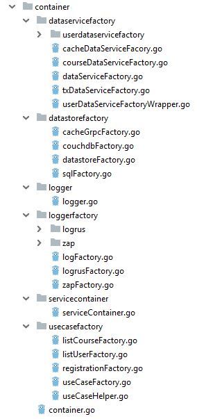 对于每个用例,例如“registration”,接口在“usecase”包中定义,但具体类型在“usecase”包下的“registration”子包中定义。 此外,容器包中有一个对应的工厂负责创建具体的用例实例。 对于“注册(registration)”用例,它是“registrationFactory.go”。 用例与用例工厂之间的关系是一对一的。 用例工厂负责创建此用例的具体类型(concrete type)并调用其他工厂来创建具体类型所需的成员(member in a struct)。 最低级别的具体类型是sql.DBs和gRPC连接,它们需要被传递给持久层,这样才能访问数据库中的数据。