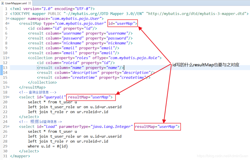 <!-- 一对多关联查询 --> <!-- 【resultMap:将整个查询结果映射到com.mybatis.pojo.User这个实体中】 【id:唯一的标识,后面的select语句中resultMap的值】 【type:映射的pojo对象,映射到com.mybatis.pojo.User这个实体中】 【autoMapping:autoMapping="true"自动映射,放在id或type后面】 结构:<resultMap id="唯一的标识" type="映射的pojo对象"> /--> <resultMap type/="com.mybatis.pojo.User" id/="userMap"/> <!-- 【id:查询列中的唯一标识,User中的唯一标识】 结构:<id column="表的主键字段或查询语句中的别名字段" jdbcType="字段类型" property="映射pojo对象的主键属性" /> 【column:与数据库表对应的字段,property:与实体对应的属性,jdbcType可以不用写会自动映射】 结构:<result column="表的一个字段" jdbcType="字段类型" property="映射到pojo对象的一个属性"/> 【假如数据库中t/_User表中的主键为user/_id,而实体属性名称为userId,则这个配置应为 <id column="user/_id" property="userId"/>,result也是一样,类似hibernate实体映射文件配置】 /--> <id column/="id" property/="id"/> <result column/="username" property/="username"/> <result column/="password" property/="password"/> <result column/="nickname" property/="nickname"/> <result column/="email" property/="email"/> <result column/="email" property/="email"/> <!-- 【collection:对关联查询到的多条记录映射到集合中】 【property:将关联查询到的多条记录映射到com.mybatis.pojo.User类的roles属性中】 【ofType:指定映射的集合属性中pojo的类型,roles属于com.mybatis.pojo.Role对象】 【autoMapping:autoMapping="true"自动映射,放在property或ofType后面】 结构:<collection property="pojo的集合属性" ofType="集合中的pojo对象"> /--> <collection property/="roles" ofType/="com.mybatis.pojo.Role"/> <!-- 【Role实体映射对应t/_role表】 【id:集合中pojo对象对应的表的主键字段】 结构:<id column="集合中pojo对象对应的表的主键字段" jdbcType="字段类型" property="集合中pojo对象的主键属性" /> 【column:与数据库表对应的字段,property:与实体对应的属性】 结构:<result column="可以为任意表的字段" jdbcType="字段类型" property="集合中的pojo对象的属性" /> /--> <id column/="roleid" property/="id"/> <result column/="name" property/="name"/> <result column/="description" property/="description"/> <result column/="createtime" property/="createtime"/> </collection/> </resultMap/>
