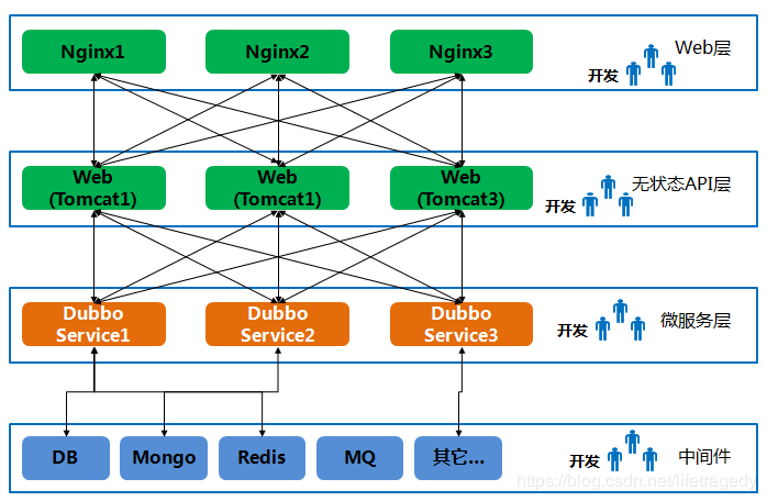 无状态的API层(一组Tomcat对Nginx Web层的API暴露)是一组开发团队;