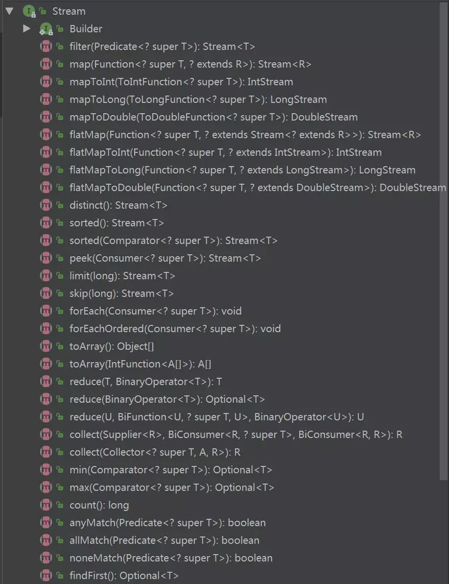 上图中是Stream类的类结构图,里面包含了大部分的中间和终止操作。