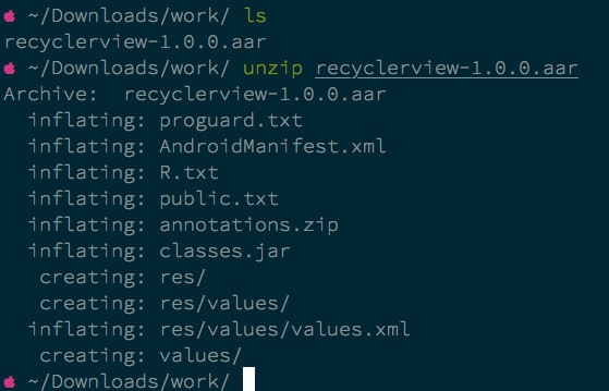 首先, aar 是一个 zip 文件,这句话应该不难理解,意思是,aar 是 zip 文件改了后缀名来的,它的二进制格式和 zip 没有啥两样,所以我们完全可以把后缀名改成 zip 再解压一下。我们以 androidx.recyclerview:recyclerview:1.0.0 这个 GAV 下过来的 aar 为例子。