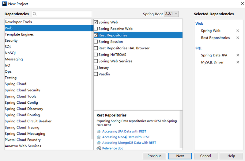首先创建一个 Spring Boot 工程,引入 Web 、 Jpa 、 MySQL 、 Rest Repositories 依赖: