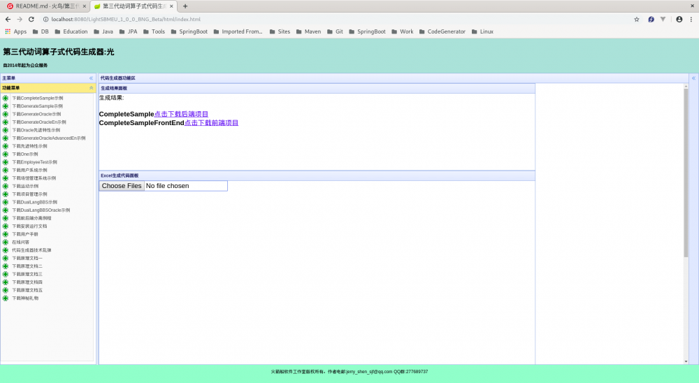 https://gitee.com/jerryshensjf/LightSBMEU/attach_files第三代动词算子式代码生成器:光SBMEU版,采用Maven, EasyUI,SpringBoot 2, MyBatis, MariaDB 技术栈