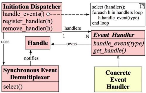 2、Event Handler和Concrete Event Handler 就是具体的事件处理器,对应netty中的handler接口和具体的handler 3、Synchronous Event Demultiplexer同步事件多路复用分发器,可以理解为nio中的select 4、Initiation Dispatcher,分发器,可以理解为nio中的循环,也就是netty中的EventLoop,处理各种事件 5、select(handlers)就是真正处理业务的地方