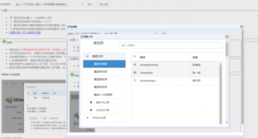 如果当前节点的访问规则设置了由上一步发送人选择,那么就要定义[接受人选择器]的样式与可选择人员的范围内容。