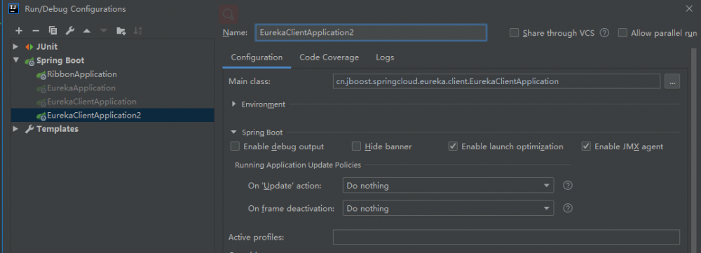 本文案例演示基于上文搭建的springcloud-eureka 与 springcloud-eureka-client 两个示例项目 ( 源码 ),依次启动两个项目,然后将springcloud-eureka-client项目的端口 server.port改为8081,新开一个springboot运行配置,如图