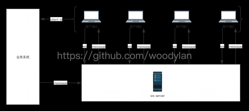 基本流程为:用ws协议连接本服务,得到一个clientId,由客户端上报这个clinetId给服务端,服务端拿到这个clientId之后,可以给这个客户端发送信息,绑定这个客户端都分组,给分组发送消息。