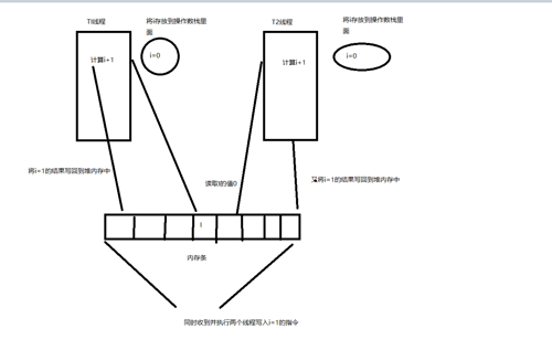 从图中展示如果两个线程都对 当前线程的操作数栈中的变量i进行+1 ,导致明明两个线程共加了两次结果却只加了1