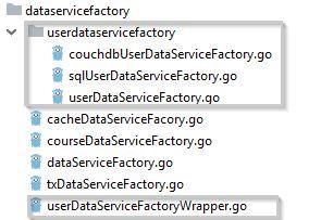 你可以从上面的图像中看到,我们需要四个文件来完成“UserDataService”,其中“userDataServiceFactoryWrapper.go”是在“userdataservicefactory”文件夹中调用实际工厂的封装器(wrapper)。 “couchdbUserDataServiceFactory.go”和“sqlUserDataServiceFactory.go”是CouchDB和MySql数据库的真正工厂。 “userDataServiceFactory.go”定义了接口。 如果你有许多数据服务,那么你将创建许多类似代码。