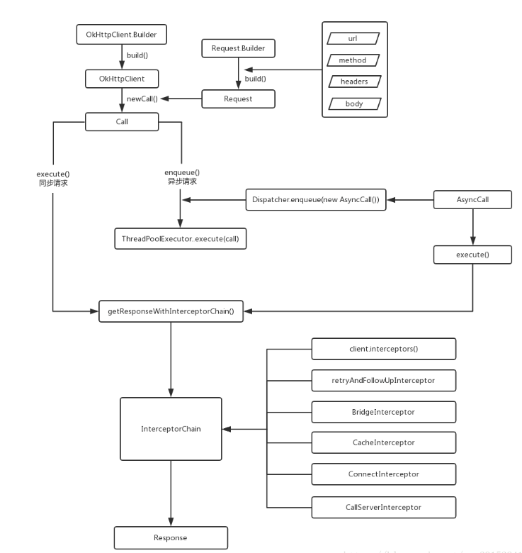 有关每个拦截器的具体实现和内部流程,读者可自行阅读源码了解,这篇文章咱们主要还是分析okhttp的整体架构。