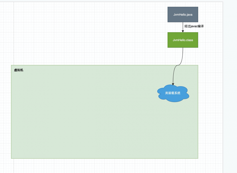 JvmHello.java -> JvmHello.class -> 类装载系统加载进来 -> 在虚拟机环境执行