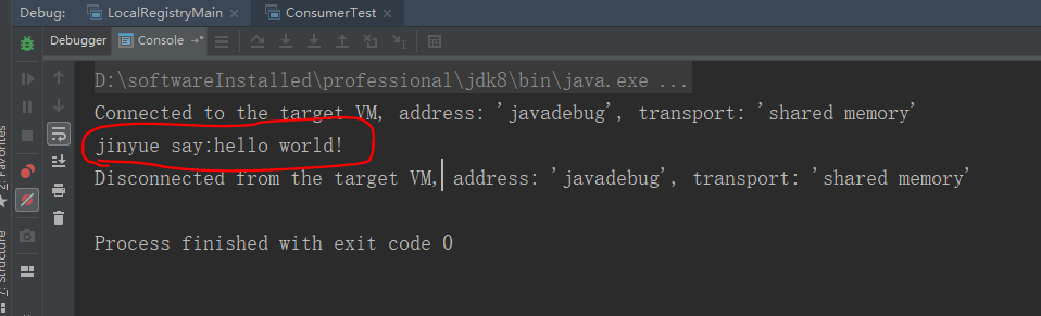 最后执行以下代码即运行前面的ConsumerTest类进行consumer通过netty rpc调用provider的sayHelloWorld方法进行测试: