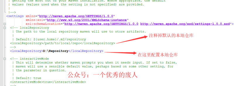 项目依赖的 jar 包是需要下载到本地才能用的。本地仓库就是从 maven 私服或者远程仓库下载的 jar 的存储地址,默认是 当前用户名/.m2/repository ,我建议改个好记的地方,后面方便检查包有没下载到本地。打开 setting.xml 搜索 localRepository 修改成自定义的地址。