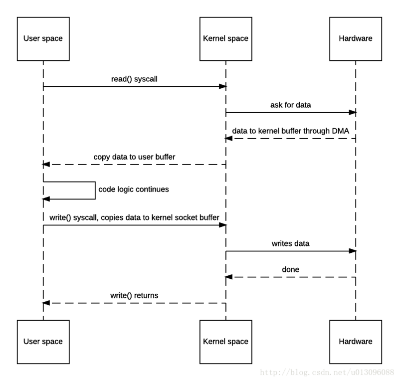 - OS进行上下文切换,切到内核模式(第一次上下文切换),通过DMA将数据从数据源读取到内核缓冲区(第一次数据拷贝:hardware->kernel-buffer)