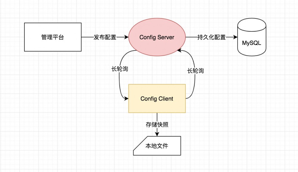 下方的架构图,简要描述了一个配置中心的大致架构,用户可以通过管理平台发布配置,通过 HTTP 调用将配置注册到服务端,服务端将之保存在 MySQL 等持久化存储引擎中;用户通过客户端 SDK 访问服务端的配置,同时建立 HTTP 的长轮询监听配置项变更,同时为了减轻服务端压力和保证容灾特性,配置项拉取到客户端之后会保存一份快照在本地文件中,SDK 优先读取文件里的内容。
