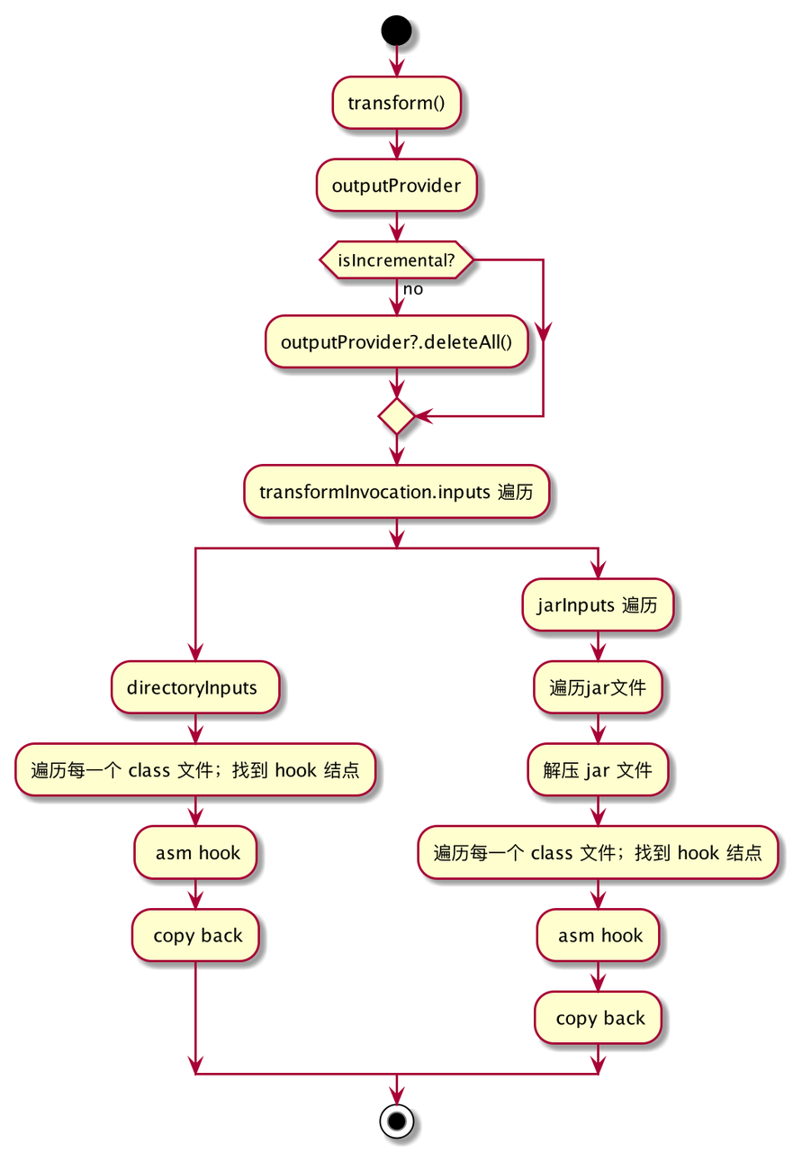 从上图可以看到,transform 处理输入的思路还是很简单的,就是从TransformInvocation 获取到总的输入后,分别按照 class目录 和 jar文件 集合的方式进行遍历处理。(这里简单讨论普遍情况,当然 TransformInvocation 接口还提供了 getReferencedInputs,getSecondaryInputs 这些接口,让使用者处理一些特殊的输入,上图并没有体现,暂时不展开讨论)