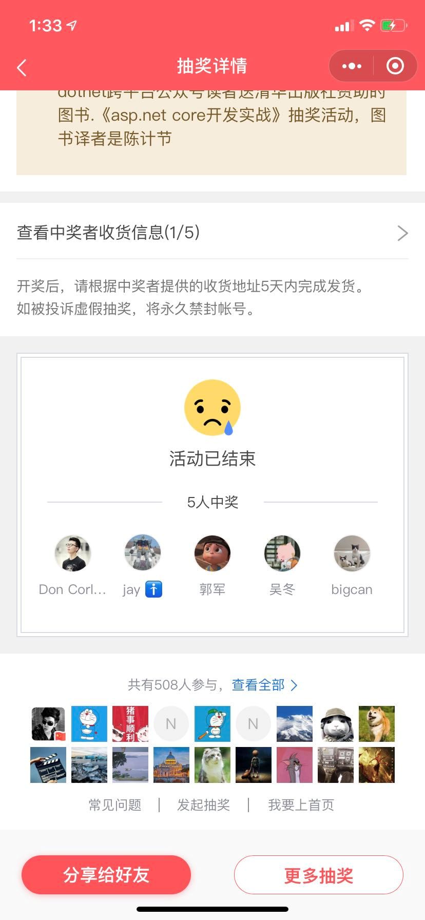 当前只有一位同学填写了地址。其他几位同学抓紧填写,3/9 日还没有完成填写将作废,奖品可是热门的《ASP.NET Core 微服务实战》。