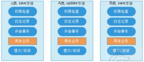 但是在职责分配的代码中,也增加了部分代码的重复性。比如在添加性能统计、日志、事务管理的代码时,就需要在每个功能的代码文件中添加重复的代码。当然也可以把这部分代码重新封装到一个新的类中,但这样一来上面哪些独立的功能封装类就出现了耦合。那怎样才能在代码中随意的加入代码且不破坏类的封装呢? 这种在运行时,动态地将代码切入到类的指定方法、指定位置上的编程思想就是面向切面的编程。