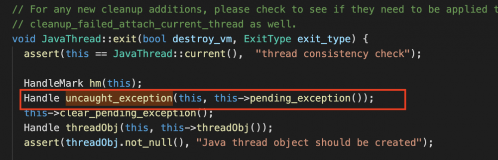 要知道,我们所写的代码都是在线程里面跑的。一个线程对应一个 Java 虚拟机栈,异常是在栈桢中发生的(即方法)。在调用发生异常时,栈桢出栈,异常一层层往上抛出,并写入调用栈信息。在整个调用栈中,如果都没有方法捕获异常,那么 Java 虚拟机将从当前线程的 Thread 对象中获取一个异常处理器,如果有,则交给异常处理器处理。走到这一步,意味着线程即将退出,这也是我从 hotspot 源码中寻找入口的依据。