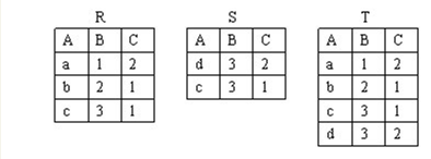 关系T中的元素与关系R和关系S中不同元素的总和, 因此为并操作。