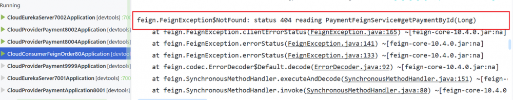 翻看cloud-provider-payment8001这个服务的Controller层代码,可以发现 getPaymentById这个方法的url是 /payment/get/{id} 而不是 /get/{id},所以在Feign调用会找不到这个方法 404 NOT FOUND