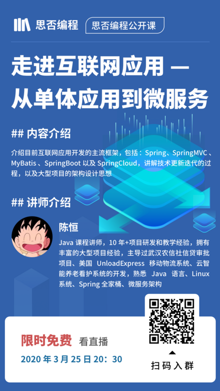 陈恒:Java课程讲师,10年+项目研发和教学经验,拥有丰富的大型项目经验,主导过武汉农信社信贷审批项目、美国UnloadExpress移动物流系统、云智能养老看护系统的开发,熟悉Java语言、Linux系统、Spring全家桶、微服务架构,授课风格风趣幽默、深入浅出、干货满满。