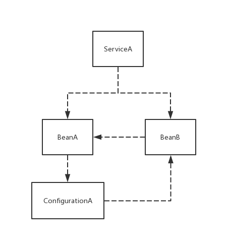这样一来,BeanA对ConfigurationA就不再是弱依赖,而是实打实的强依赖了(也就是说ConfigurationA的初始化不仅影响了BeanA的依赖填充,也影响了BeanA的实例构造)。