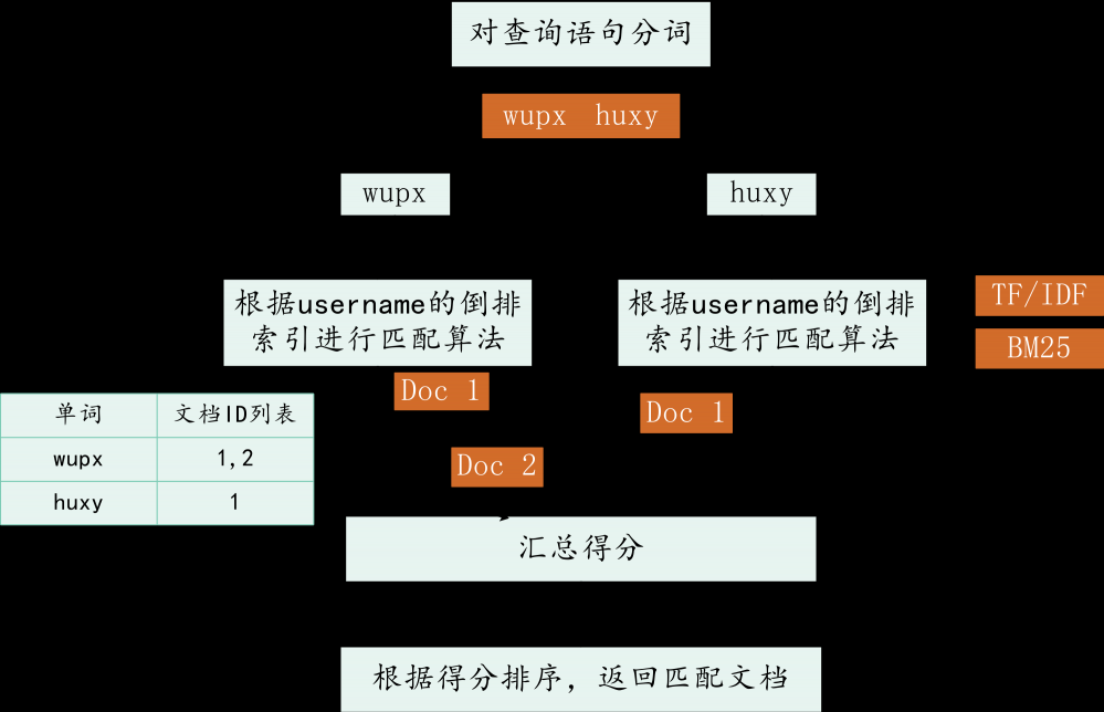首先对查询语句进行 分词 ,分成 wupx 和 huxy 两个 Term,然后 ES 会拿到 username 的倒排索引,对 wupx 和 huxy 去进行匹配的算分,比如 wupx 对应的文档是 1 和 2, huxy 对应的文档为 1,然后 ES 会利用算分算法(比如 TF/IDF 和 BM25,BM25 模型 5.x 之后的默认模型)列出文档跟查询的匹配得分,然后 ES 会对 wupx huxy 的文档的得分结果做一个汇总,最终根据得分排序,返回匹配文档。