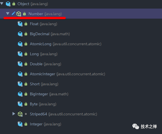 Long类继承自Number基类,Number类为一个抽象类,代表数。下图展示了Integer、Long、Byte、Short、Float和Double都是继承自Number。