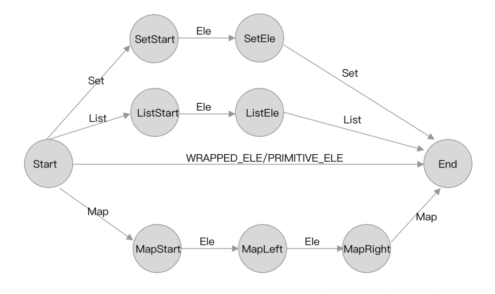 首先是确定状态,我定义了 Start/SetStart/SetEle/ListStart/ListEel/MapStart/MapLeft/MapRight 八种基础状态,由于一次只解析一个类型,容器闭合就代表着解析结束,所以没有对各个容器设置结束状态。又因为有状态嵌套的存在,而一个状态没法表达状态机的准确状态,需要使用栈来存储整体的解析状态,我使用这个栈为空来代表 End 状态,又省略了一个状态。